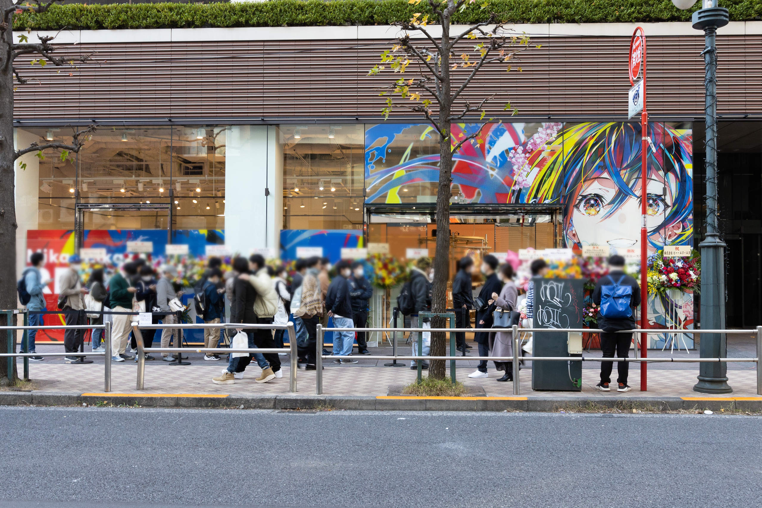 展示会場の外壁は、本個展のために描き下ろされたメインビジュアル「POP」が大胆にプリントされており、渋谷の街でひときわ目を引きます。