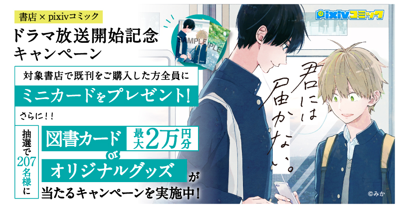 pixivコミックで『君には届かない。』3巻分のエピソードを無料で再公開します。また、書店とコラボし、図書カードやオリジナルグッズなど豪華賞品があたるさまざまなキャンペーンを実施するほか、一部書店では特設エリアの展開や限定チラシの配布も行います。