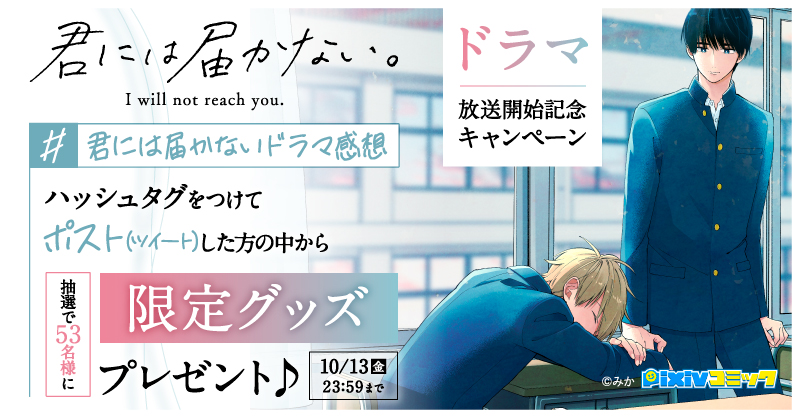 ピクシブ株式会社(本社:東京都渋谷区、代表取締役:國枝信吾、以下ピクシブ)は、マンガサービス「pixivコミック」発の人気作品『君には届かない。』のドラマ放送開始を記念して、2023年9月29日(金)より5つのキャンペーンを開催します。