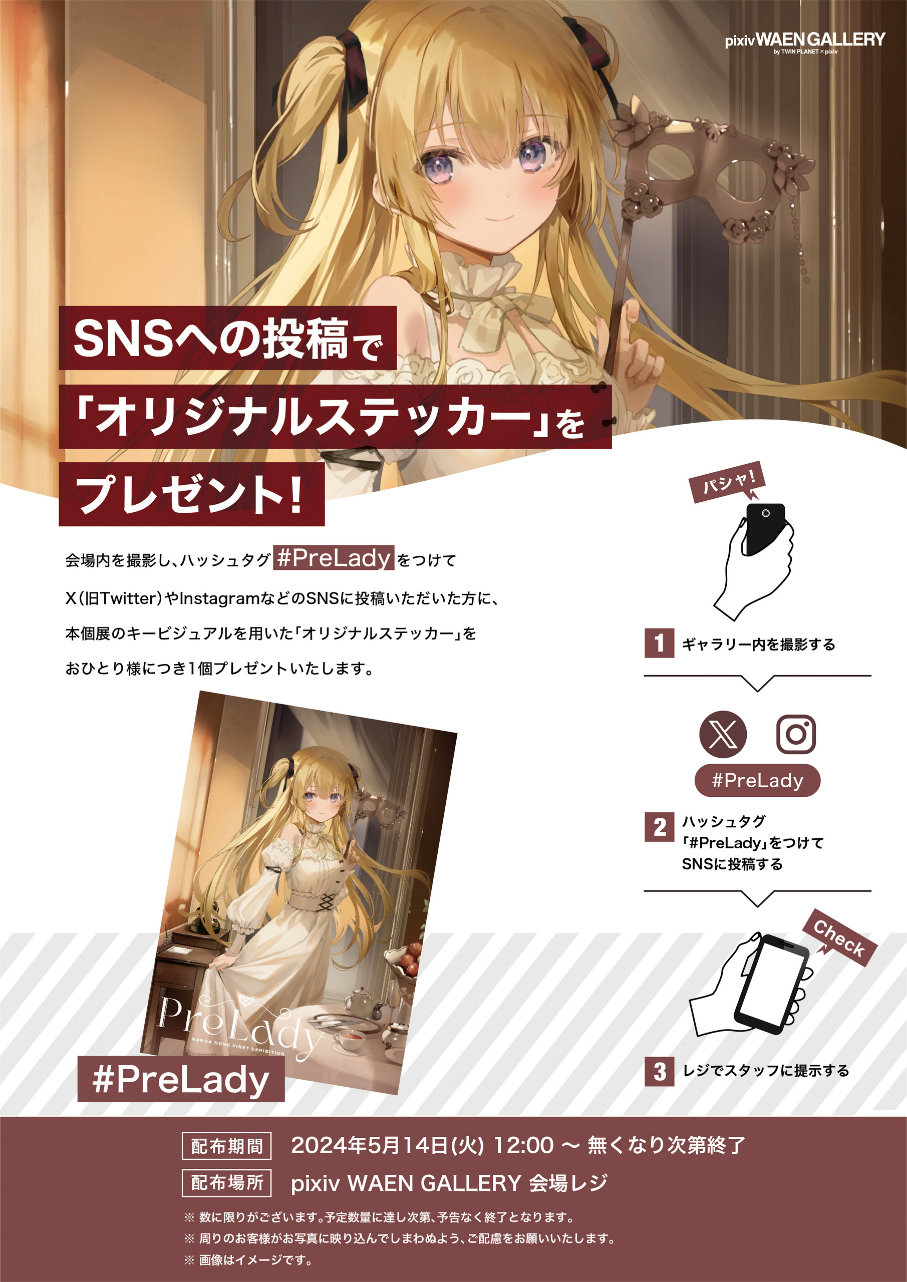 会場内を撮影し、ハッシュタグ「#PreLady」をつけてX(旧Twitter)やInstagramなどのSNSに投稿いただいた方に、本個展の描き下ろしキービジュアルを用いた「オリジナルステッカー」をお一人様につき1枚プレゼントいたします。