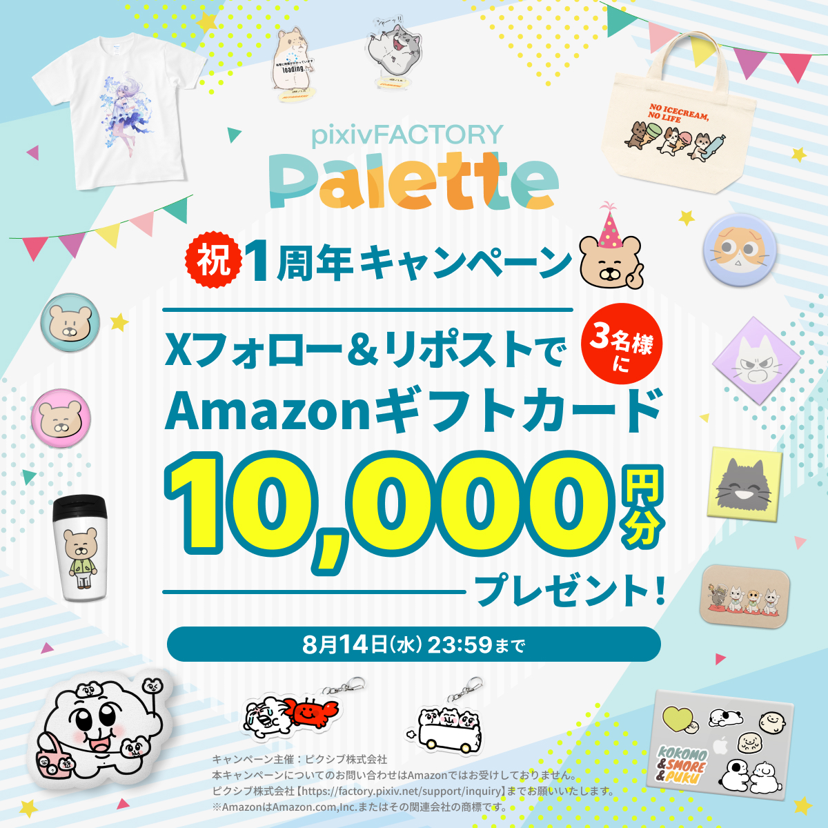 ピクシブ株式会社(本社:東京都渋谷区、代表取締役CEO:丹羽 康弘、以下ピクシブ)が運営する、大人気のクリエイターや作品のイラストを自由に選んでオリジナルグッズをデザインできるサービス「pixivFACTORY Palette」は2024年8月17日(土)にサービスリリース1周年を迎えます。1周年を記念して2024年8月1日(木)より3つの企画を順次実施します。