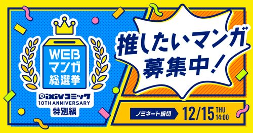 ピクシブ株式会社(本社:東京都渋谷区、代表取締役:國枝 信吾、以下ピクシブ)は、日本出版販売株式会社(本社:東京都千代田区、代表取締役社長:奥村 景二)と協同し、WebマンガNo.1を決める大型投票イベント「WEBマンガ総選挙 pixivコミック10周年 特別…